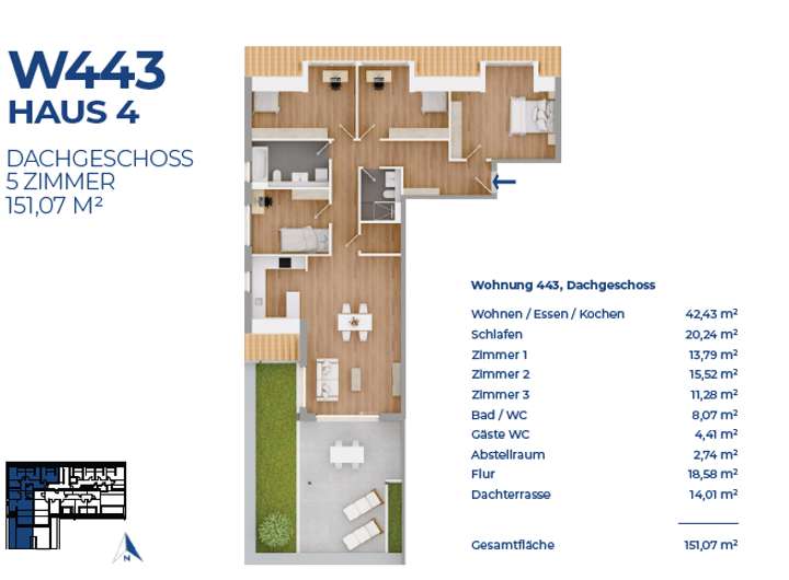 Vier Schlafräume, zwei Bäder, ein großer Wohn-Ess- und Kochbereich und eine wunderschöne sonnige Dachterrasse erfüllen all Ihre Wohnwünsche.