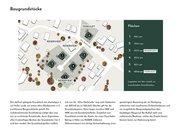 Zum Verkauf stehen 3 ebenerdige Baugrundstücke im Herzen, also im alten Ortskern von Crossen. Die dörfliche Ruhe in Verbindung mit der relativ guten Infrastruktur machen hier das Wohnen lebenswert. Grundschule, Bäcker und Fleischer sind fußläufig erreichbar. Vorgegeben ist aufgrund der Lage lediglich der Baustil. Dieser soll sich am dörflichen Ortsbild anpassen. Die Zufahrtstraße inkl. Wendehammer werden hierbei zur Privatstraße und müssen mit erworben werden. Verkauft wird vollerschlossen inklusive der kompletten Architektenleistung bezüglich des Bauantrages.