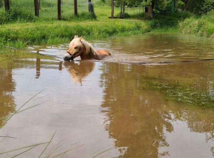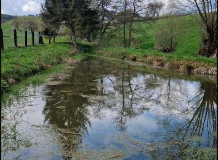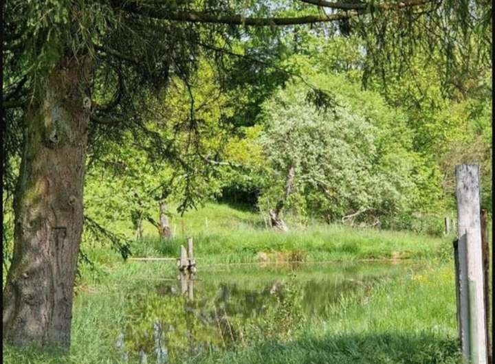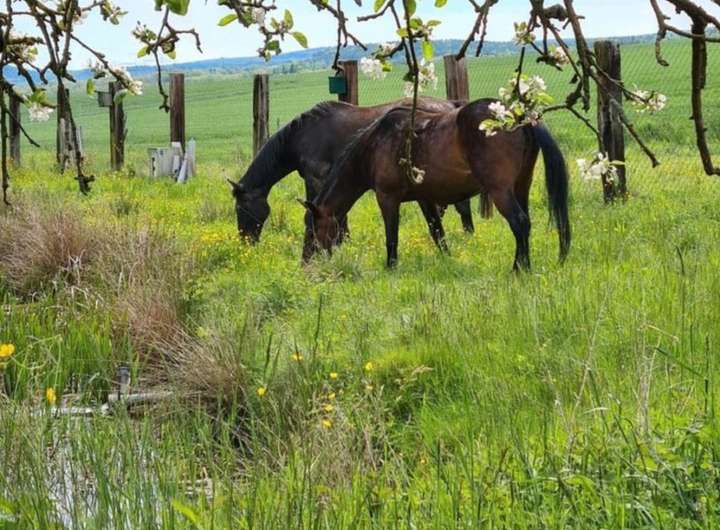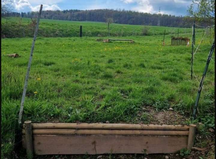 Die Teiche werden vom angrenzenden Bach gefüllt. Um immer Wasser zu gewähren befindet sich außerdem ein 31m! tiefer Brunnen auf dem Grundstück. Auf der Weide befindet sich derzeit noch ein kleiner Geländeplatz mit Naturhindernissen, auch hier ist ein weiterer Ausbau möglich.
