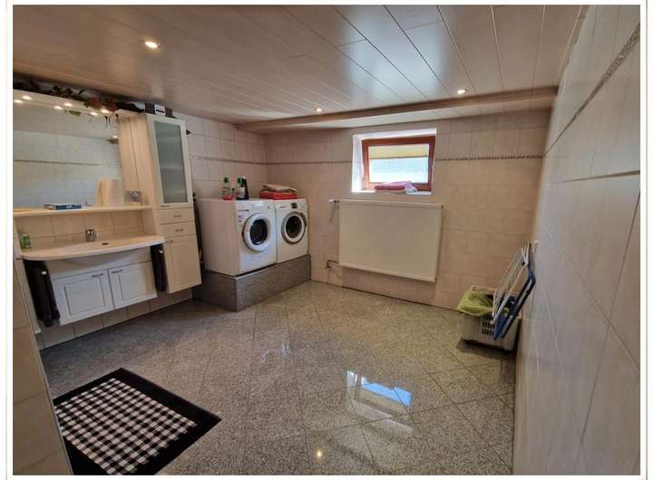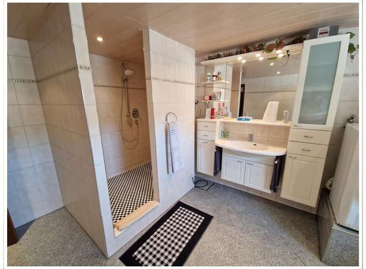 Neues Bad im Untergeschoss, mit Granitfliesen und begehbarer großer Dusche, sowie Platz für Waschmaschine, trockner und weitere Hauswirtschaft;