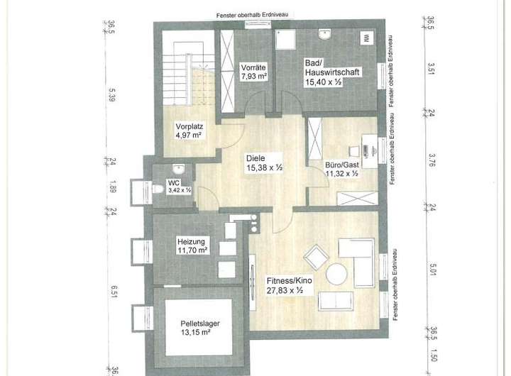 4 Räume im Untergeschoss haben normales Tageslicht, da die Fenster sich oberhalb des Erdniveaus befinden;