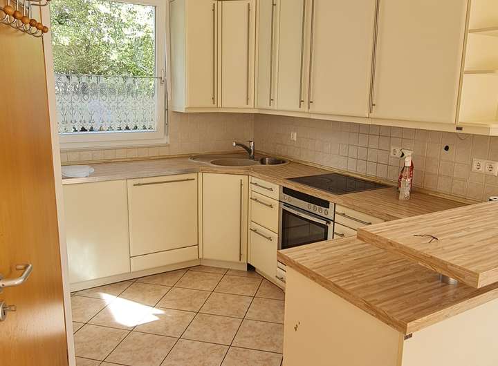 Eine Einbauküche steht zur Verfügung. Ein Autostellplatz direkt neben dem Haus mit Zugang zum Garten.