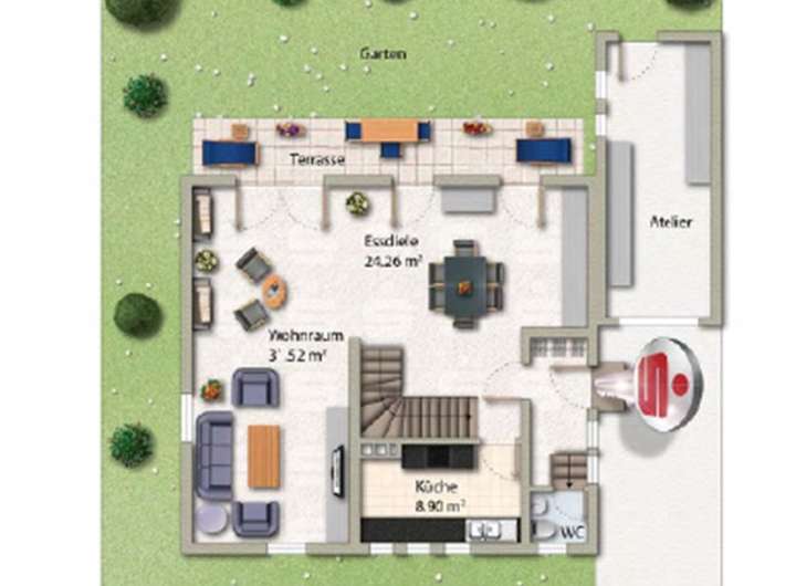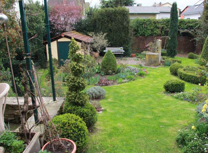 Im EG besteht Zugang zu einem Atelier, welches der Wohnfläche nicht zugerechnet ist. Die ebenfalls im EG befindliche Küche ist voll ausgestattet. Die Heizung (Fußbodenheizung im EG) basiert auf Öl und wird durch einen Kaminofen (Holz) im EG ergänzt. Vom EG gelangt man direkt über die Terrasse in den großen Garten, wo sich auch ein gemauertes Gartenhaus sowie ein Brunnen befindet. Das Haus ist vollunterkellert. Im OG hat man von 3 Schlafzimmern direkten Zugang zum Balkon mit Blick in den Garten.