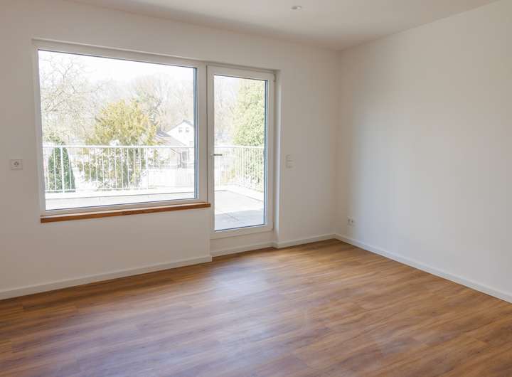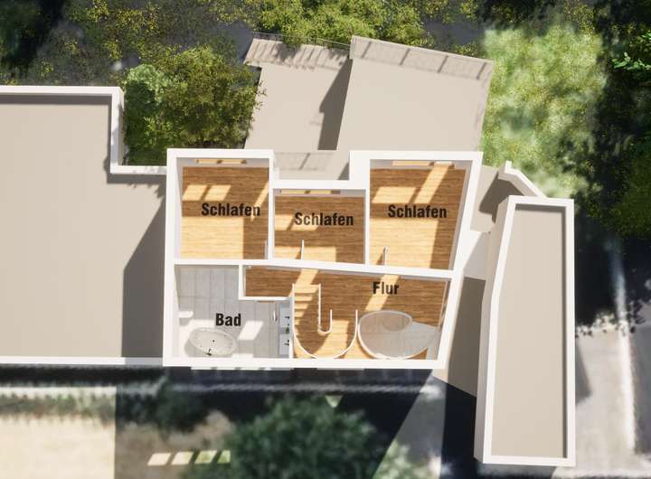 3 Zimmer. Großes Bad mit freistehender Badewanne, 2 Waschbecken und Walk-In-Dusche. Dachterrasse (S/W) mit Blick in den Garten. Holzboden Eiche.