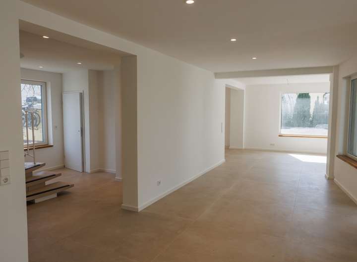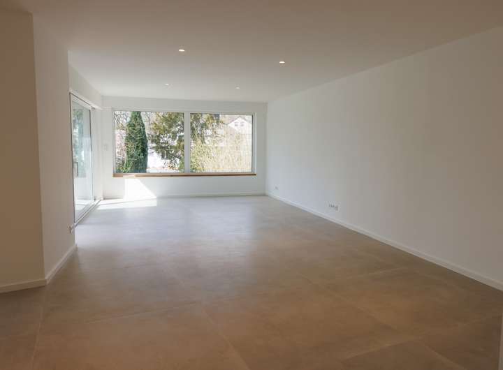 1 großer Wohnbereich mit angrenzendem Esszimmer und offener Küche. Gäste-WC. Glasfront mit Zugang zur Terrasse und Garten. 1,20m x 1,20m große Bodenfliesen in Betonoptik (Farbe: greige).