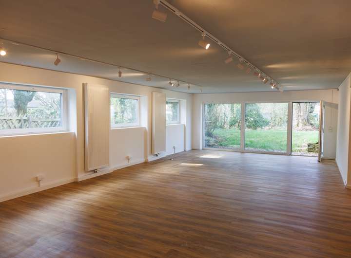 Atelier (ca. 70 qm) mit Dusche. Separater Hauseingang. Eigener Wasser- und Stromanschluss. Diverse Nutzungsmöglichkeiten. Glasfront in den Garten. Weinkeller. Holzboden Eiche.