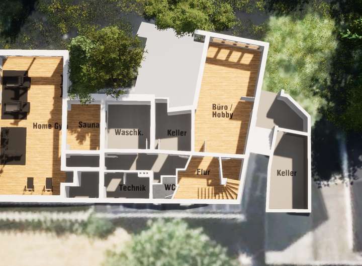 1 Gästezimmer mit separatem Hauseingang. Gäste-WC. Technikraum. Heizungskeller. 2 x Kellerräume. Holzboden Eiche.