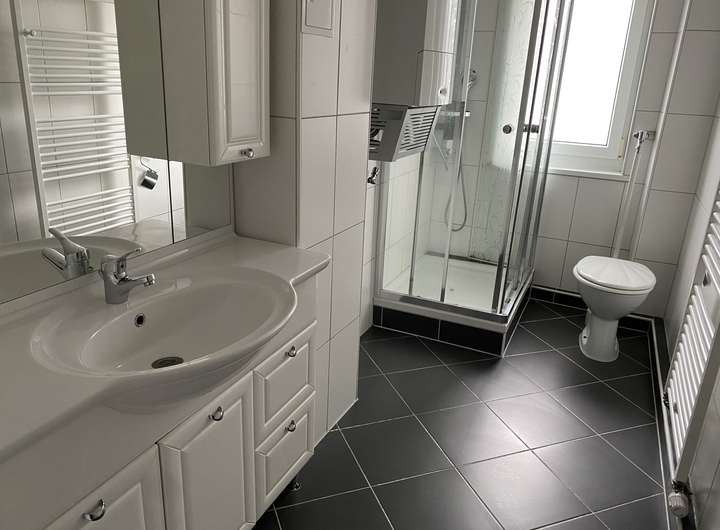 Das Tageslichtbad mit Dusche befindet sich in einem gepflegten Zustand und wird zusätzlich mit einem neuen WC und Waschtisch ausgestattet. Ein Balkon lädt zum Entspannen im Freien ein.