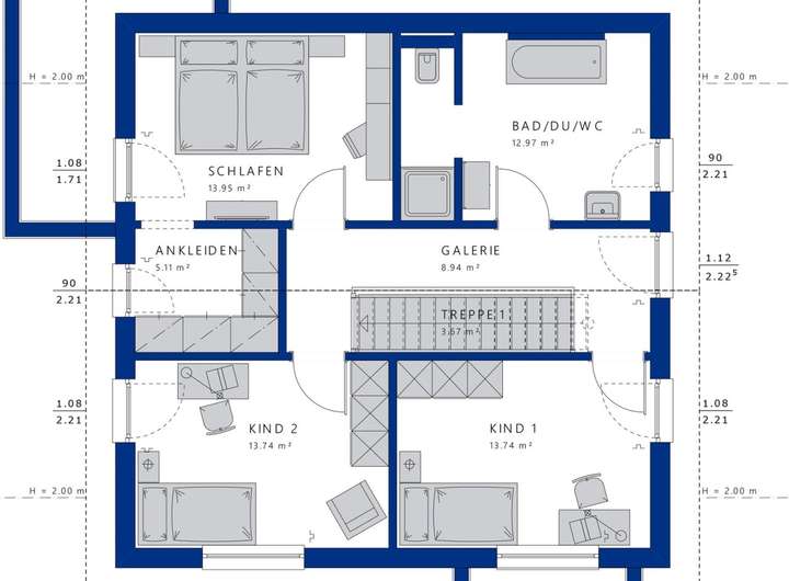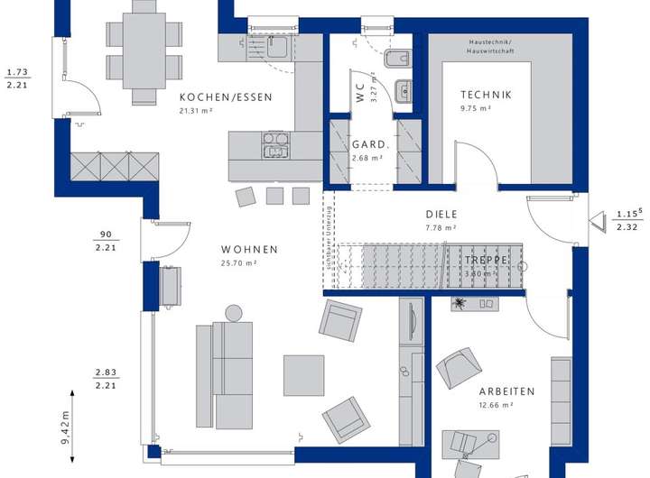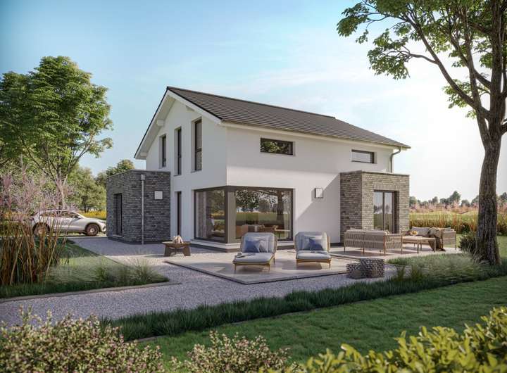 In der Basisvariante beträgt die Nettogrundfläche knapp 160 m² - viel Raum für eine vierköpfige Familie, die hier all ihre Wohnwünsche ausleben kann. Der Grundriss überzeugt mit seiner klaren, alltagstauglichen Struktur. Betreten wird das Haus über eine geräumige Diele, die auch die gerade Treppe beherbergt. Linker Hand wird sie von einem großen Arbeitszimmer flankiert, das sich bis in den Erker hinein erstreckt. Rechts liegen der Technik- bzw. Hauswirtschaftsraum und das Gäste-WC mit vorgelagerter Garderobe. Über einen offenen Durchgang schließen sich die Gemeinschaftsräume an die Diele an. Dank der cleveren Raumaufteilung bleibt das Familienleben fremden Blicken zunächst verborgen. Erst wenn man das Raumensemble betritt, erschließt sich das komplette Wohngeschehen. Der vordere Bereich bietet sich für eine lange Theke mit schicken Barhockern an: Hier könnte bei der nächsten Familienfeier ein kleiner Aperitif gereicht werden, bevor die Gäste es sich auf der Couch oder am großen Esstisch im Erker bequem machen. Auch für die Kaffeepause zwischendurch ist die Theke der perfekte Ort. Wer Ruhe und Entspannung sucht, der begibt sich eine Ebene höher. Mit zwei nahezu identisch geschnittenen Kinderzimmern, einem Elternschlafraum mit Ankleide und einem luxuriösen Badezimmer inklusive Wanne und Dusche bleibt im Dachgeschoss garantiert kein Wunsch offen.