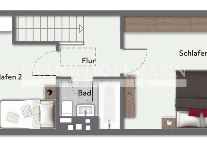 Im Obergeschoss erwarten Sie zwei großzügige Schlafzimmer sowie ein Badezimmer mit Badewanne, das zum Entspannen einlädt.