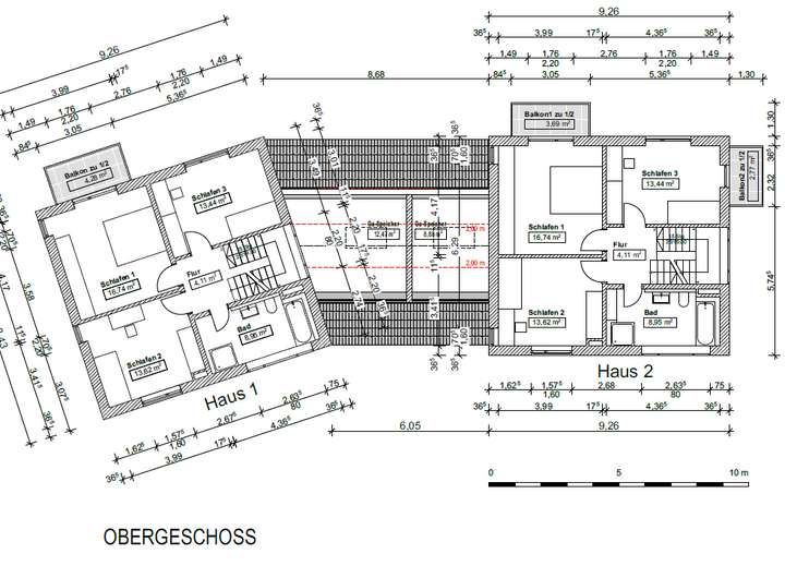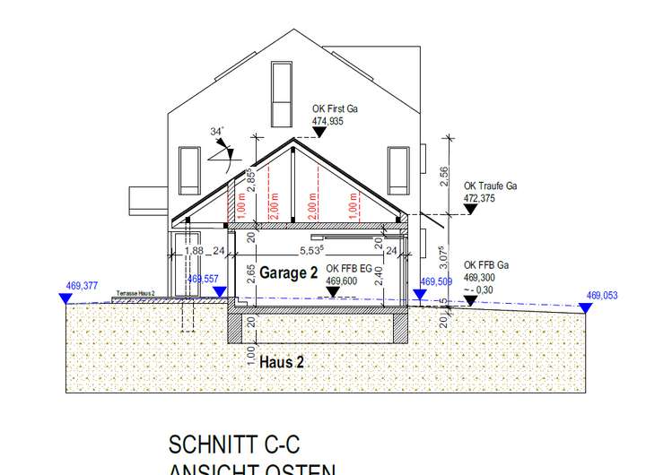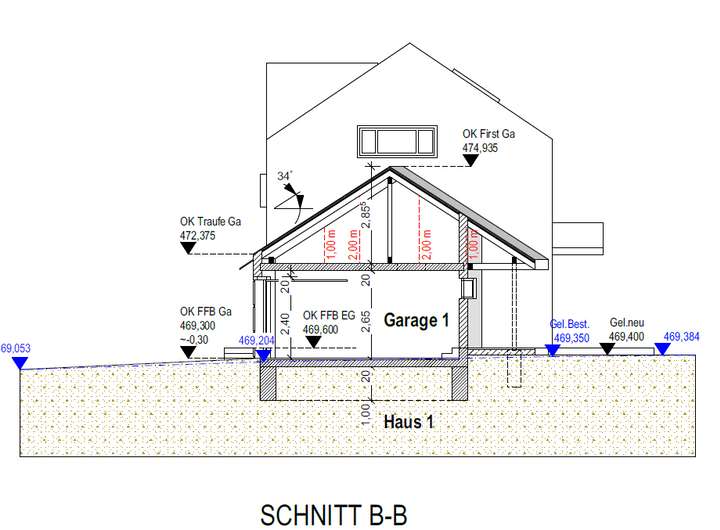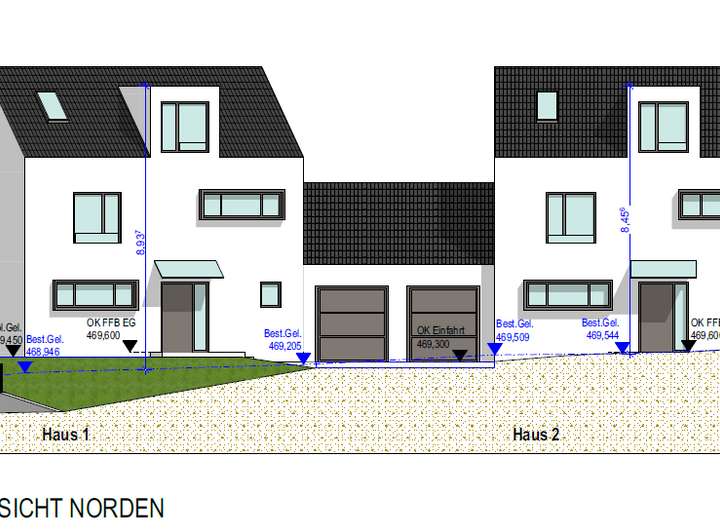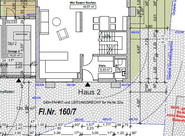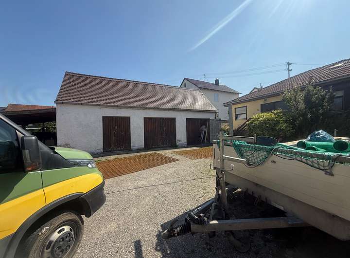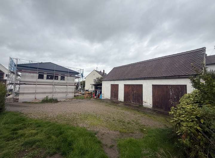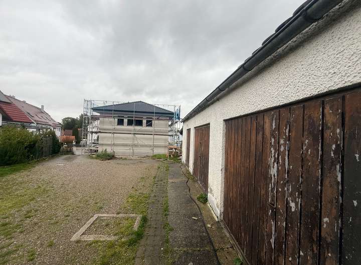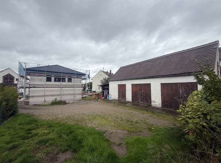 Aktuell befinden sich auf dem Grundstück noch Garagen, die vor Baubeginn abgerissen werden müssen. Die Zufahrt ist rechtlich gesichert durch ein Geh- und Fahrrecht. Zusätzlich kann auf dem Grundstück eine eigene Garage errichtet werden, während an der Straße ein Stellplatz für das zweite Haus entsteht.