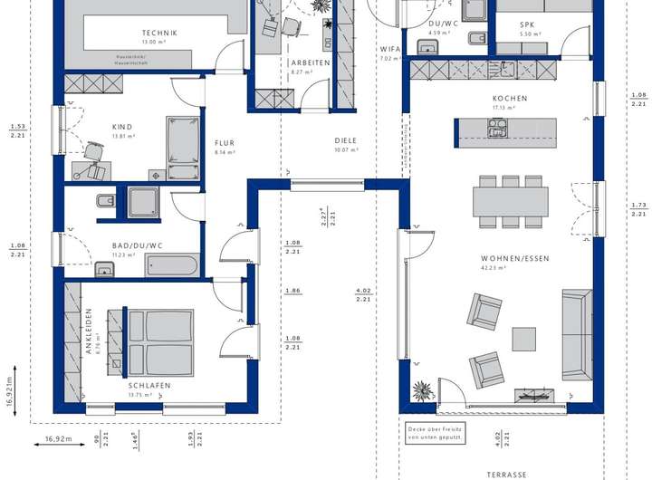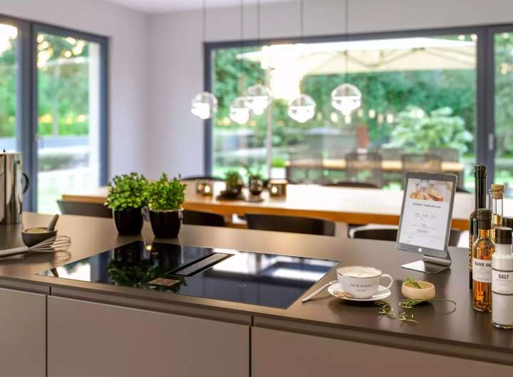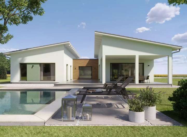 Mit rund 160 m² funktioniert der Bungalow nicht nur für Singles und Paare, sondern auch für Familien mit bis zu zwei Kindern - und das bis ins hohe Alter hinein. Betreten wird das Gebäude über einen Windfang, der fließend in eine repräsentative Diele übergeht. In Eingangsnähe befinden sich ein Gästebad mit Dusche sowie ein helles Homeoffice - ideal für Berufstätige, die öfter von zu Hause aus arbeiten. Natürlich kann der Raum auch als Gästezimmer, als Hobbybereich oder als zusätzliches Kinderzimmer genutzt werden - den eigenen Wünschen und Ideen sind keine Grenzen gesetzt. Der linke Trakt des Bungalows ist den gemeinschaftlichen Aktivitäten gewidmet. Die einzelnen Funktionsbereiche Wohnen, Essen und Kochen bilden eine harmonische Einheit. Strukturieren lässt sich das Raumensemble beispielsweise durch eine frei stehende Kochinsel mit praktischer Theke. Die großzügige Panoramaverglasung flutet die offen angelegten Gemeinschaftsräume mit Tageslicht und schafft eine Verbindung zur Natur. Ebenso großzügig, luftig und hell geht es in den Privaträumen im rechten Gebäudeflügel zu. Zwei geräumige Schlafzimmer und ein luxuriöses Bad lassen hier garantiert keine Wohnwünsche offen. Das elterliche Schlafzimmer besitzt einen Zugang zur Terrasse. So kann man kurz vor dem Zubettgehen noch einmal einen Blick in den Sternenhimmel werfen. Ergänzt wird das Raumangebot von einem Technikraum und einer Speisekammer, die sich direkt an die Küche anschließt.