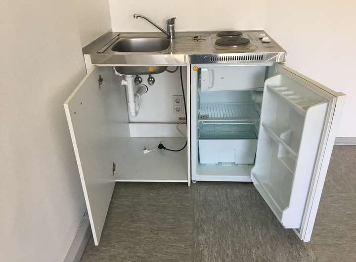 Für den Start im neuen Eigenheim stehen bereits eine Single-Küche inklusive einem kleinen Kühlschrank mit Gefrierfach zur Verfügung.