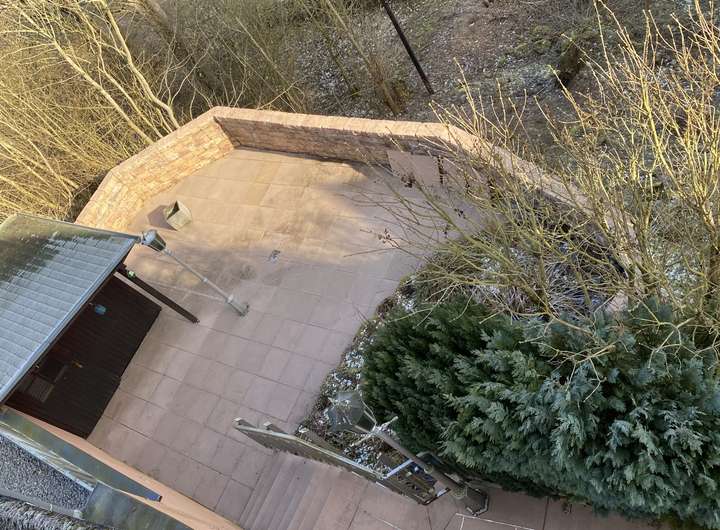 Erholen Sie sich auf der liebevoll gestalteten Terrasse mit Gartenhaus und Teich. Das Grundstück hinter dem Haus ist ein Hanggrundstück.