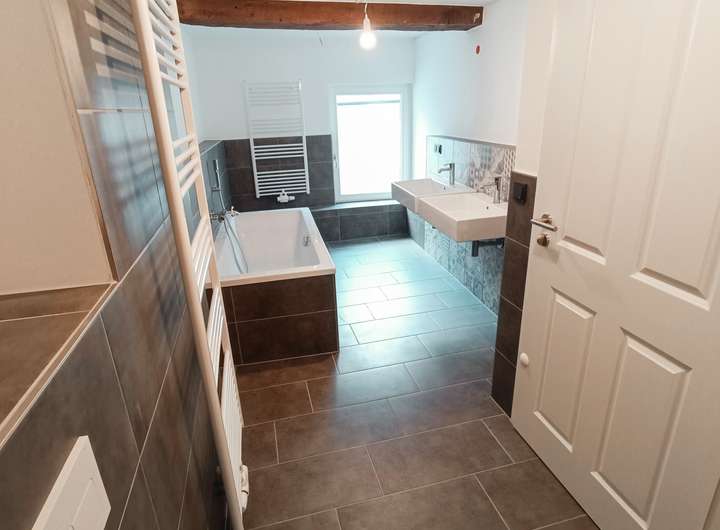 Sie besitzt ein Schlafzimmer, ein großes Badezimmer (mit zwei Waschtischen, Dusche, Badewanne) und einen großen Wohn- Essbereich zum Neuen Markt.