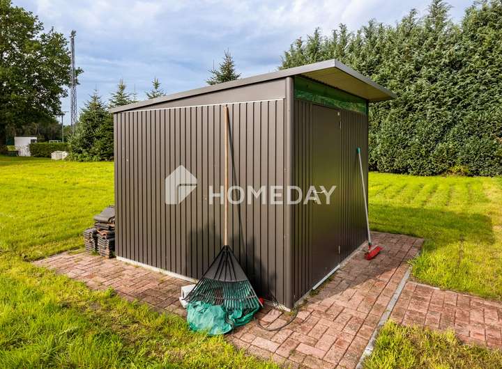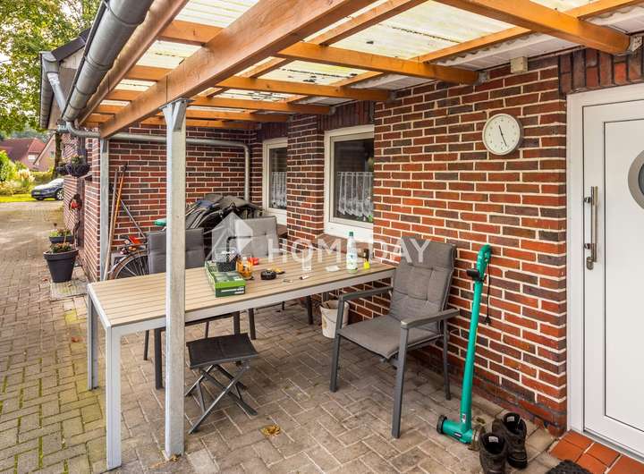 Der pflegeleichte und liebevoll gestaltete Garten bietet genügend Raum für die ganze Familie und ist teilweise von Hecken umgeben und eingezäunt, wodurch ein alter Baumstamm geschützt wird. Ein Gartenhäuschen vervollständigt den Außenbereich. Die überdachte Terrasse erstreckt sich in Richtung Nordosten und lädt zu entspannten Stunden im Freien ein.