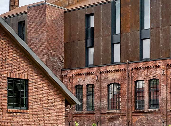 Der industrielle Charme des Bestandgebäudes wird in die Aufstockung übertragen und durch sichtbare Stahlträger und vertikale Fensterbänder, die bis ins Dach hineinragen, unterstrichen. Ein besonderes Highlight ist der sichtbare historische Schornstein im Wohnbereich, der dem Penthouse eine besondere Atmosphäre verleiht.