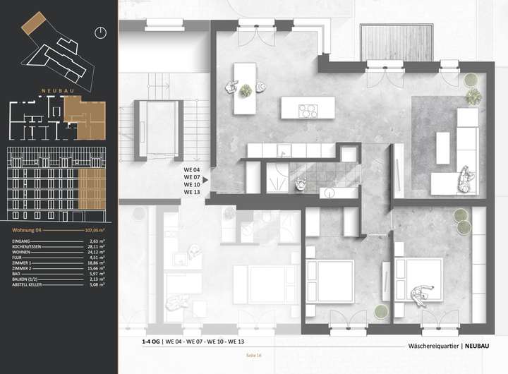 Mit einem Kellergeschoss mit Tiefgarage, fünf Regelgeschossen und einem Dachgeschoss (Penthouse) entsteht ein Mehrfamilienhaus mit 15 Wohneinheiten. Davon befindet sich eine Wohnung im EG, jeweils drei Wohnungen in den Regelgeschossen und zwei Wohnungen im Penthouse. Alle Wohnungen sind barrierefrei erreichbar und zugänglich errichtet.