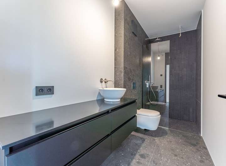 - Griffloser Waschtisch in mattschwarz mit Steinauflage