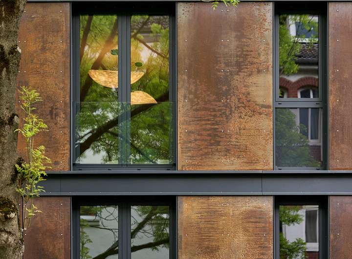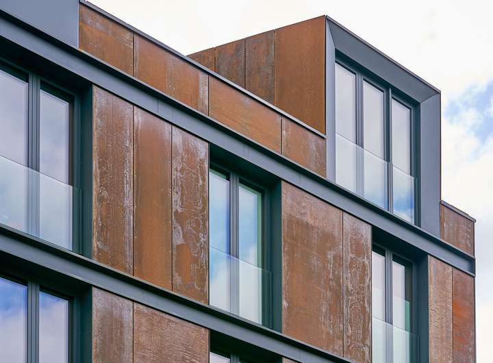 Der Neubau an der Dörnbergstraße bildet das Entrée in das angesagte „Wäschereiquartier“. Die Fassade aus Cortenstahl und der Sichtbeton im Innern bilden den Charakter der Einheiten und lehnen sich konzeptionell an den alten Industriecharme an.