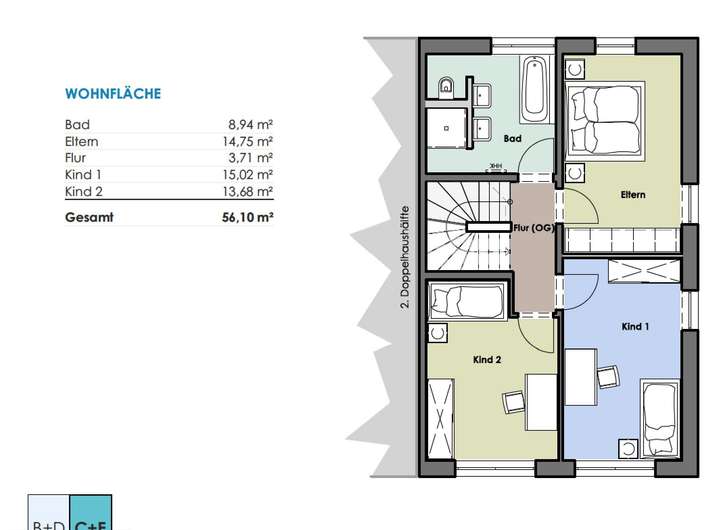 Im Obergeschoss befinden sich das Schlafzimmer, 2 Kinderzimmer und das große Familienbad.