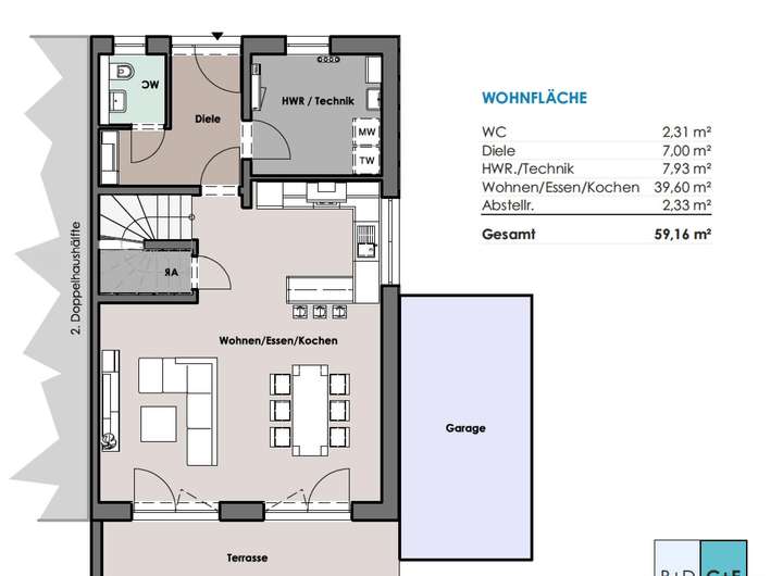 Jedes der Häuser verfügt im Erdgeschoss über einen ca. 40 m² großen, offenen Wohnbereich mit offener Küche, einer Eingangsdiele mit Zugang zum Gäste-WC und Technikraum sowie einem Abstellraum unter der Treppe. Durch den Wohnbereich gelangen Sie auf die große Terrasse und in den Garten.