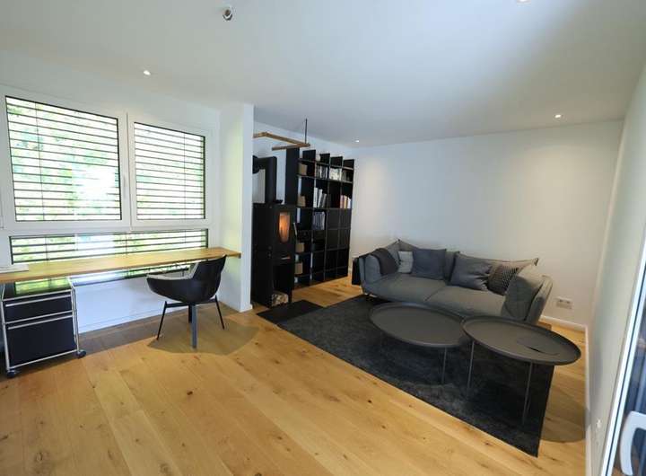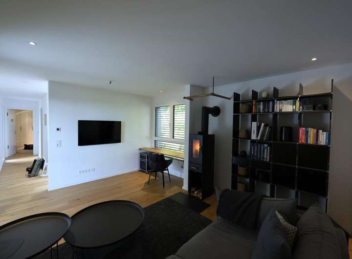 Das Wohnzimmer ist mit dem Ofen und Zugang zum Balkon (überdacht) sehr komfortabel.