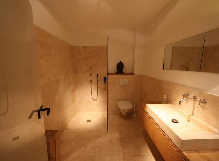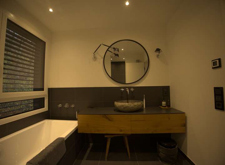 Die Bäder sind extrem hochwertig ausgestattet. Das Master-Bad verfügt über eine Badewanne mit Blick in den Wald.