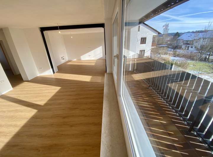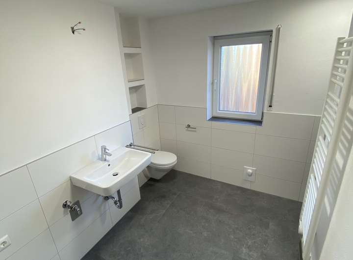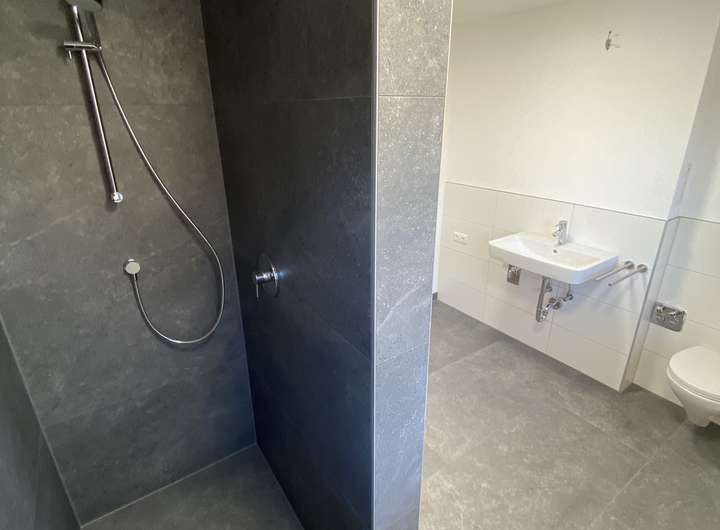 Das neue Badezimmer verfügt über eine bodenebene Dusche mit Fußbodenheizung sowie Anschlüsse für Waschmaschine und Trockner. Der großzügige Wohnbereich mit großen Fensterfronten zur Südseite sorgt für ein angenehm helles Wohnambiente.
