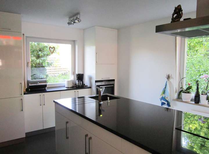 Das attraktive Einfamilienhaus befindet sich im schönen Weinort Veitshöchheim in der Nähe der Weinberge am Schenkenfeld. Das Haus verfügt über eine Wohnfläche von ca. 130 qm, die sich auf 4 Zimmer über 3 Etagen verteilen. Im EG befindet sich der Eingangsbereich mit Gäste-WC und die offene, großzügige Küche. Die Küche ist sehr hochwertig ausgestattet, nach Maß eingebaut und wäre vom Mieter nach Absprache abzulösen. Eine halbe Etage höher geht es an der Küche vorbei nach oben in den offenen Wohn- und Essbereich. Von hier aus eröffnet sich der Blick über die Terrasse in den Garten.