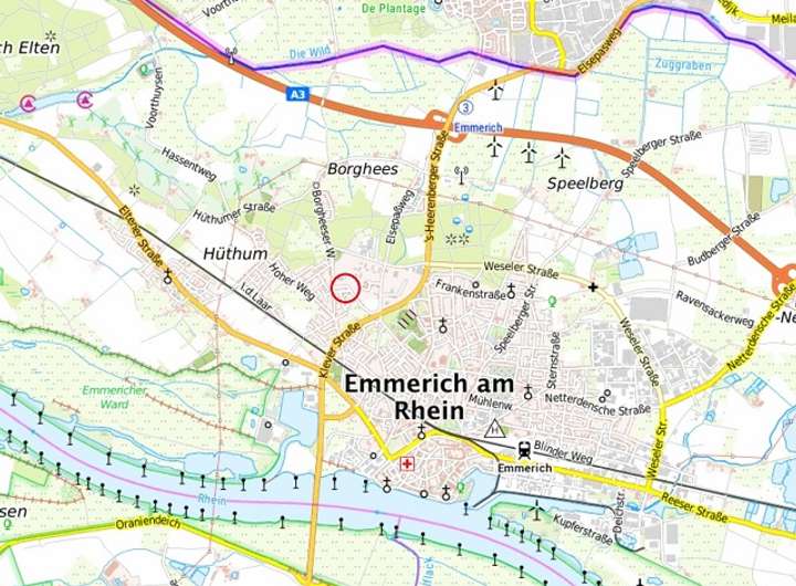 Das Verkaufsobjekt liegt nordwestlich des Zentrums von Emmerich am Rhein in der Straße ´Am Busch´ bzw. ´Borgheeser Weg´.