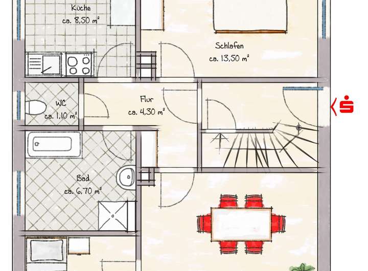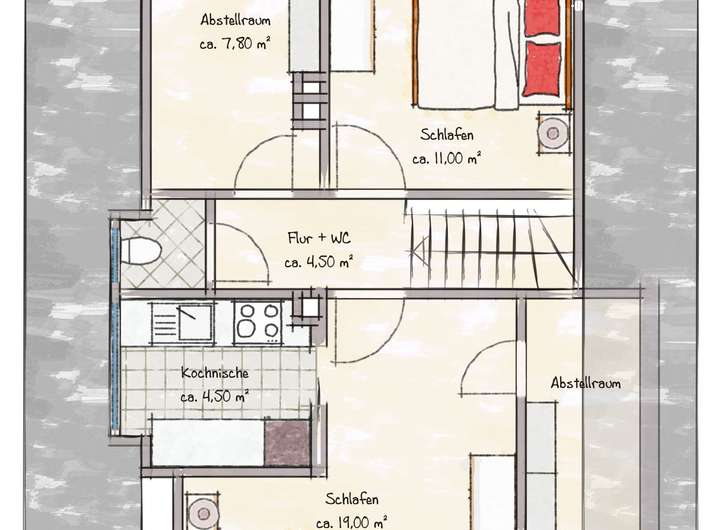 Im Erdgeschoss befinden sich der Wohn- und Essbereich, 2 Schlafräume, die Küche sowie das Tageslichtbad welches mit Dusche und Wanne ausgestattet ist.