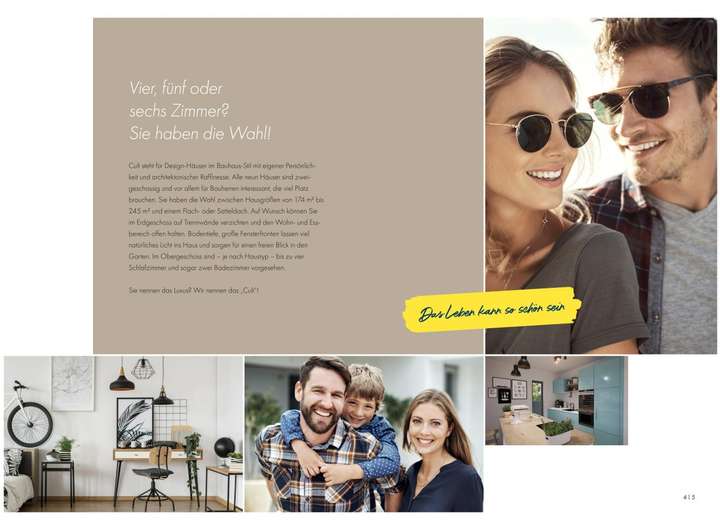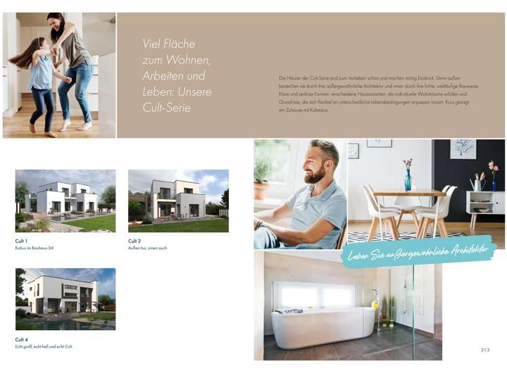 Cult 1 V3 bietet mit mehr als 240 m² jede Menge Platz, um die Tagesabläufe einer Familie angenehm gestalten zu können. Offene Raumübergänge, sowie die intelligente Anordnung der Zimmer ermöglichen gemütliches Beisammensein, aber auch individuelle Rückzugspunkte für die Bewohner. Beeindrucke deine Besucher bereits beim Betreten des Hauses durch die großzügig angelegte Diele, welche direkt zum Gästezimmer führt. Natürlich könnte hieraus auch ein Arbeitszimmer entstehen - ganz wie es dir beliebt. Über die halbgewendelte Massivholztreppe erreichst du das Obergeschoss, in dem sich 3 Schlafräume und das lichtdurchflutete Badezimmer befinden. Jedes der Zimmer bietet einen Zugang zu einem Balkon, wovon der größere mit 51 m² ein auch von außen beeindruckendes Highlight bietet.