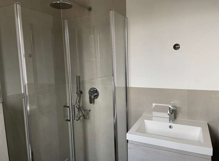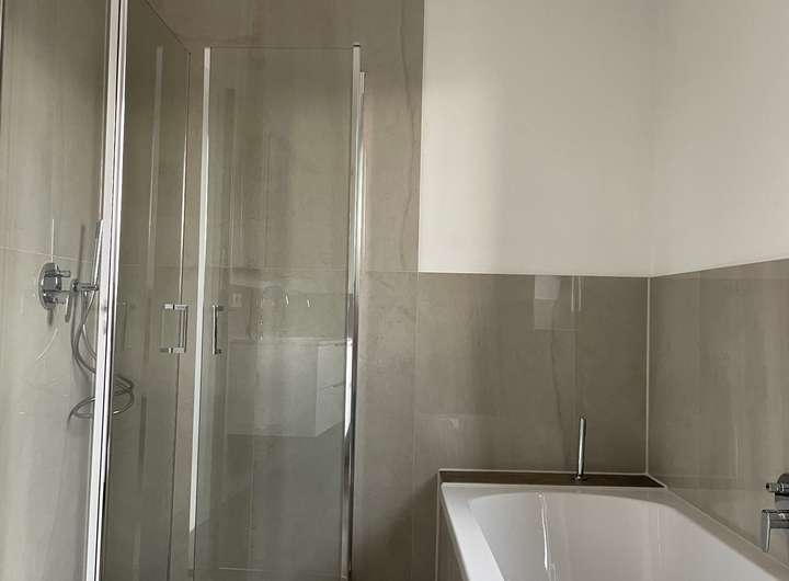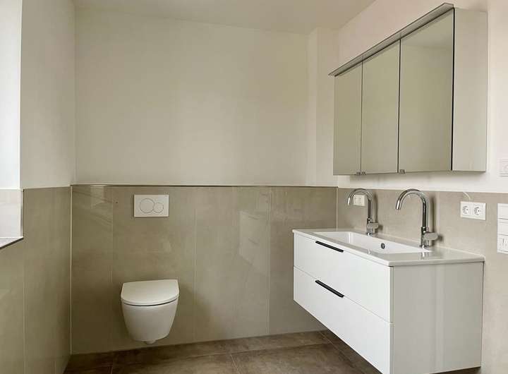 Ein großes Bad mit Wanne und bodenebener Dusche sowie Doppelwaschtisch garantieren einen entspannten Start in den Tag. Machen Sie einen Rundgang im Obergeschoss: