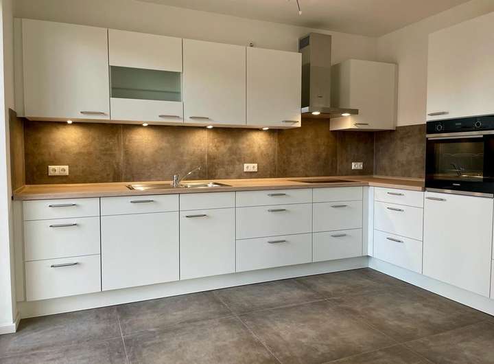 Die offene, moderne Küche lädt zum gemeinsamen Kochen und Schlemmen ein. Im Sommer lässt sich dies ganz einfach auf die Terrasse verlegen. In dem direkt an die Küche anschließenden Hauswirtschaftsraum lassen sich alle Vorräte hierfür unterbringen.