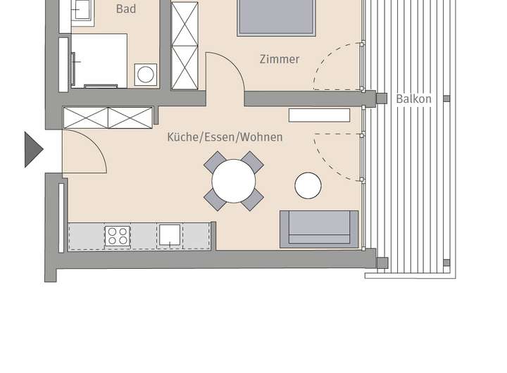 Das hier dargestellte 2-Zimmer-Apartment Nr. 22 befindet sich in der Ebene 3. Auf der selben Ebene ist auch der Fitness-/Wellnessbereich untergebracht, sodass Sie den Tag stets mit einem Sprung ins kühle Nass beginnen können!