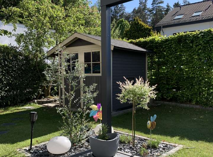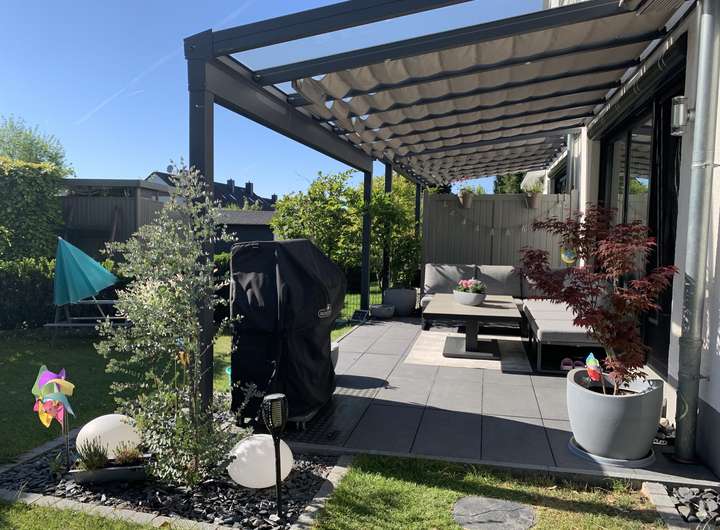 Der Garten wurde liebevoll angelegt und gepflegt. Der komplette Rasenbereich sowie die Hecken werden durch ein unterirdisches Bluetooth Bewässerungssystem versorgt. Zusätzlich wurde eine Terrassenüberdachung (Aluminium mit Glas) zum Schutz vor Nässe und Sonne errichtet.