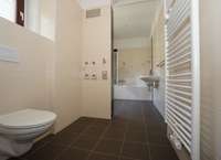 + großes, modern gefliestes Bad mit Badewanne, Handtuchheizkörper und Waschmaschinen-Stellplatz