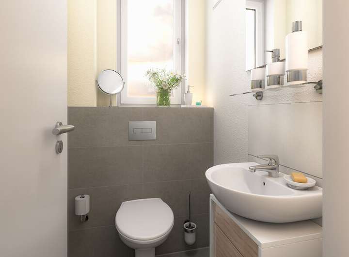 • Badausstattung mit Fliesen (Format 30 x 60 cm)
