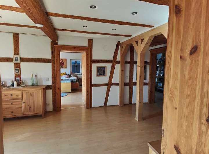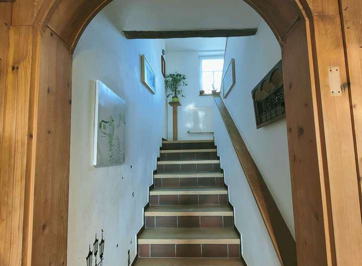 Über die gepflegte buchenholzbelegte Steintreppe geht es hinauf in den ersten Stock - früher der Tanzboden, wo sich heute Schlafräume und Badezimmer befinden. Das Dachgeschoss bietet zusätzliche Ausbaureserve.