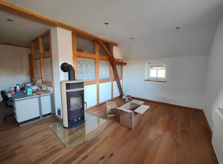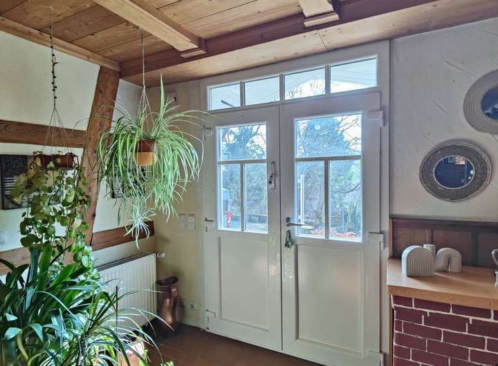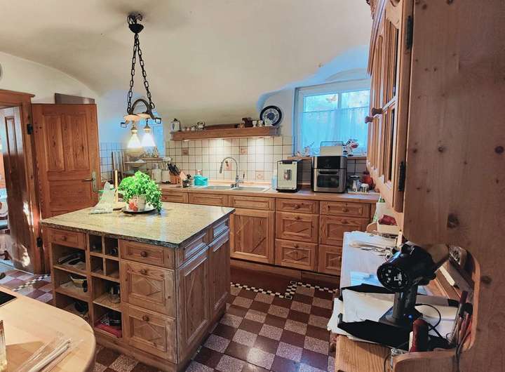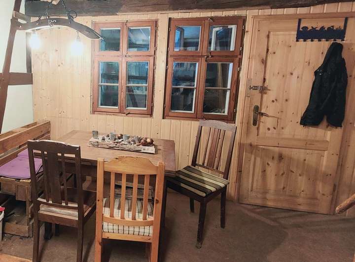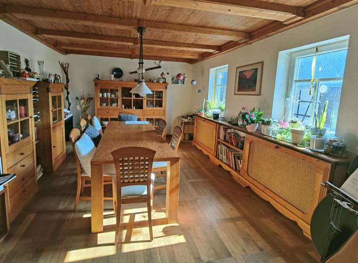 Schon wenn man das Erdgeschoss des Haupthauses betritt und in der geräumigen Diele steht, erahnt man die Aufteilung des ehemaligen Wirtshauses. Der ehemalige große Gastraum beherbergt heute ein gemütliches Wohn-/Esszimmer mit Kaminofen. Mittig die Küche mit den originalen Terrazzofliesen und umlaufender Holzküche (im Kaufpreis inbegrifen) und rechter Hand ein gemütliches Esszimmer.