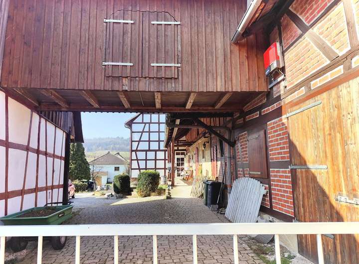 Im Anbau des Hauses finden sich eine grosse Werkstatt (ca. 65m²), der Pferdestall mit sieben geräumigen Boxen und "Reiterstübchen" im Untergeschoss und eine (an den Pächter der Pferdehaltung vermietete) Einliegerwohnung im Obergeschoss mit separatem Zugang.