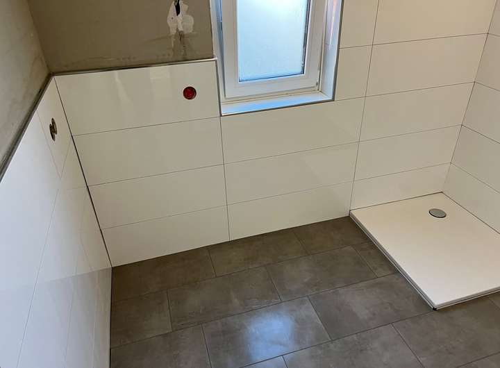 Das Tageslichtbadezimmer wird zu einem zeitgemäßen Highlight umgestaltet, mit weißen 30*90 Fliesen an den Wänden und attraktiven grauen Bodenfliesen. Das Badezimmer ist mit einer Dusche ausgestattet. Die neuen Sanitäreinrichtungen im modernen Stil runden die Wohlfühloase hier ab.