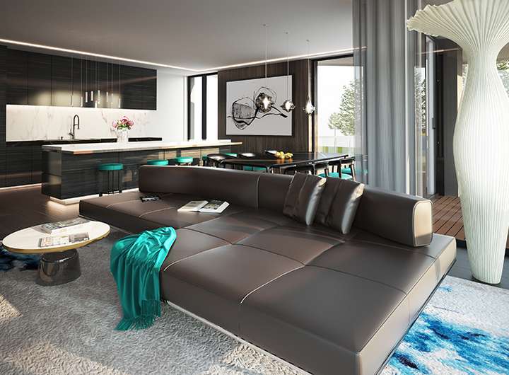 Thomas Muehe greift in seinem Design auf Materialien wie polierten Stahl, hochwertiges Leder und mahagoni-rotes Holz zurück, die das ikonische Riva-Design verkörpern. Auf Wunsch sind die Wohnungen auch komplett möbliert und können individuell gestaltet werden, einschließlich Bad und Küche, sowie mit einer eigenen Interior Collection für einzigartige Möbelarrangements.