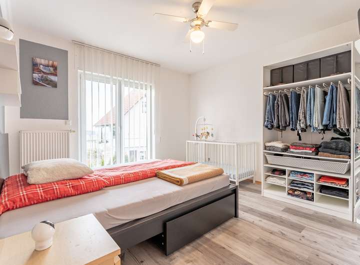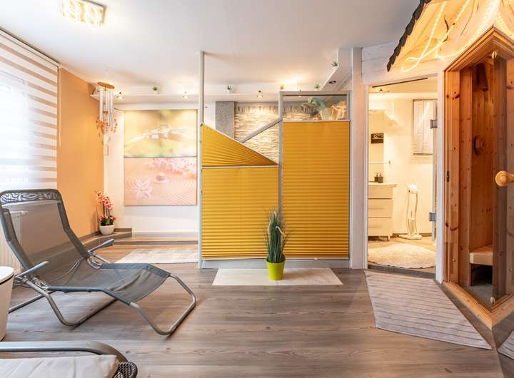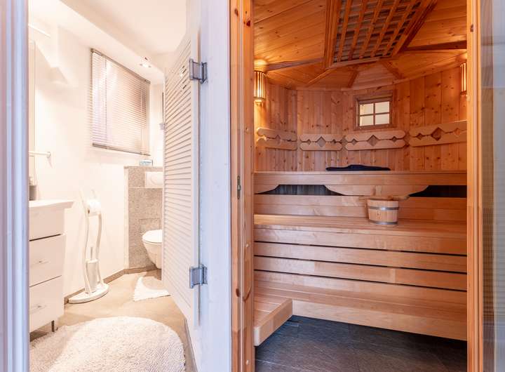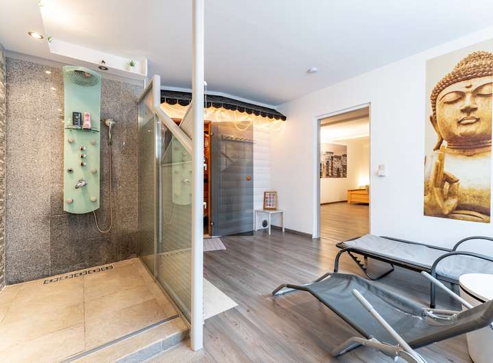 Im Untergeschoss ergänzt ein Gäste- bzw. Ferienapartment (1,5 Zimmer) mit eigener Küchenzeile das Raumangebot. Der großzügige Spa-Bereich mit Sauna, bodengleicher Dusche und Whirlwanne lädt zum Entspannen ein.