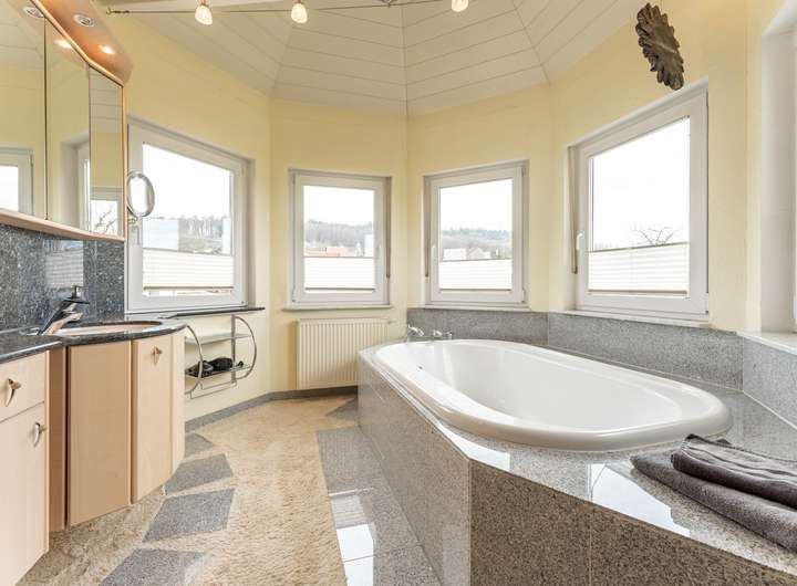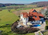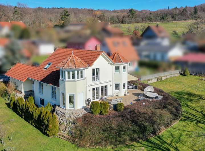 Ein kleines Schloss im Grünen: Diese 1998 errichtete Liegenschaft mit ihren beiden markanten Türmen liegt ruhig am Ortsrand von Kandern – umgeben von Wiesen und Feldern, mit weitem Blick und viel Privatsphäre. Auf rund 269 m² Wohnfläche vereint das Haus familiengerechtes Wohnen, Arbeiten und Wohnen auf Zeit in besonderer Atmosphäre.