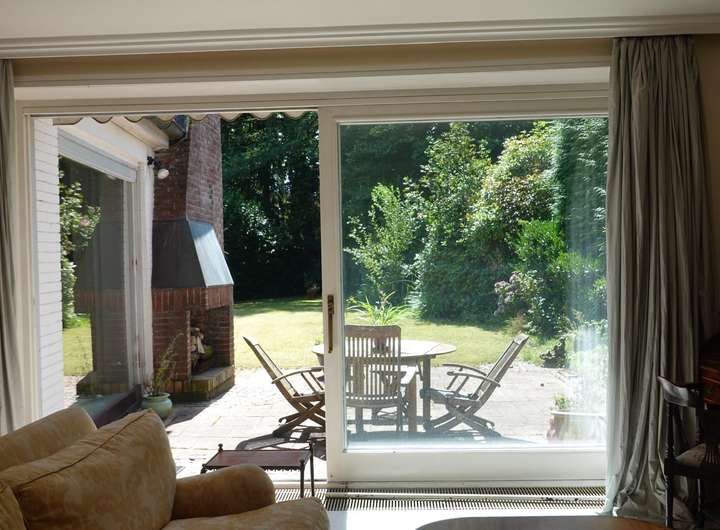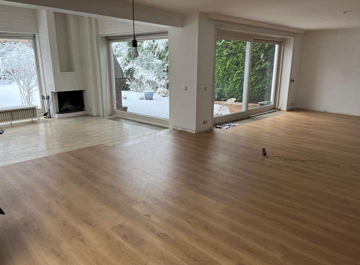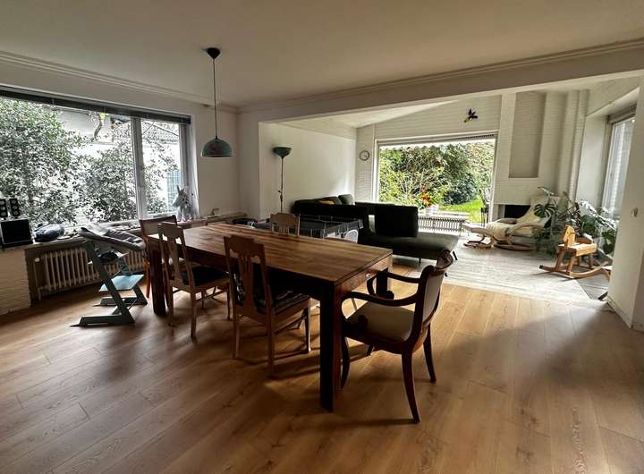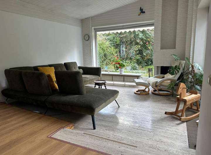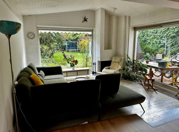 Es gibt bodentiefe Fenster, einen grossen Wohn- und Essbereich. Das Süd-Grundstück hat einen grossen Garten mit Terrasse und Kamin.