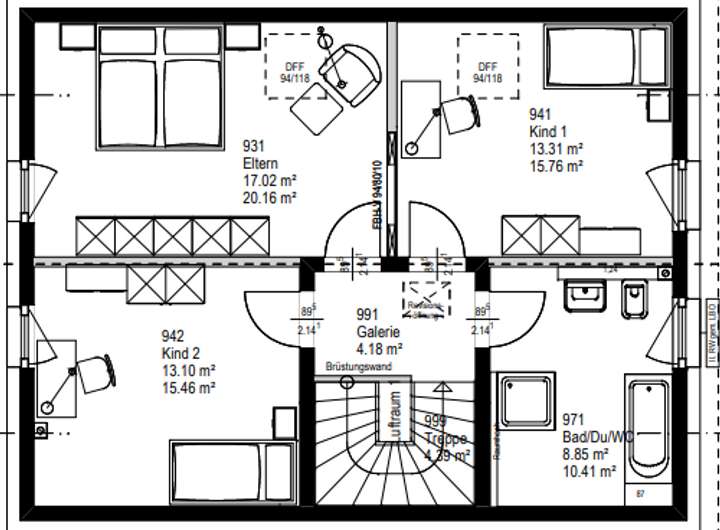 Im Obergeschoss befinden sich Elternschlafzimmer, zwei geräumige Kinderzimmer sowie ein großes Bad mit Badewanne und Dusche. Der Keller
