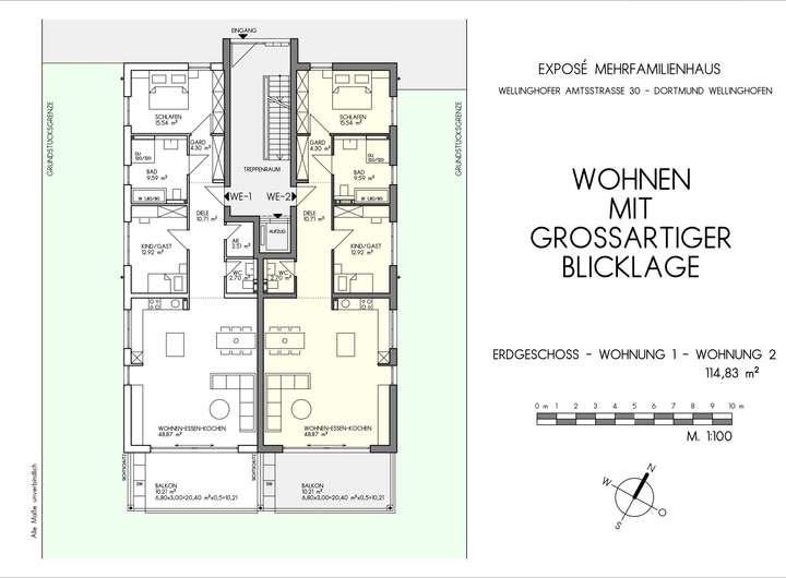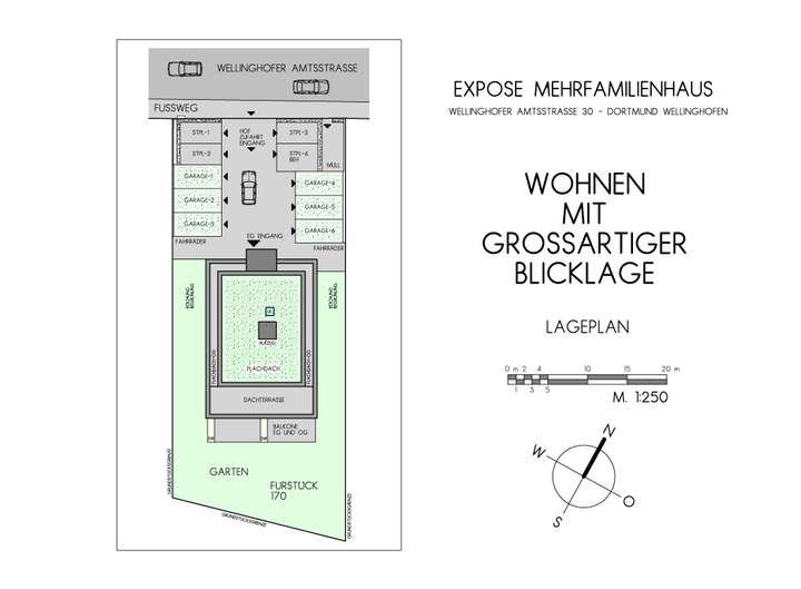 Das moderne Mehrfamilienhaus befindet sich im Ortsteil Wellinghofen und verfügt über 6 exklusive, individuell geplante Wohnungen von ca. 100 m² - 150 m² Wohnfläche in wunderschöner Blicklage. Alle Wohnungen zeichnen sich durch eine exzellente Aufteilung, große gut geschnittene Räume mit großen, bodentiefen Fenstern aus. Die Wohnungen verfügen in Süd-Ost- Ausrichtung jeweils über einen Balkon oder eine Terrasse. Es sind 6 Außengaragen (Preis je Garage: 25.000 Euro) und 4 Stellplätze (Preis je Stellplatz: 12.000 Euro) auf dem Grundstück geplant.