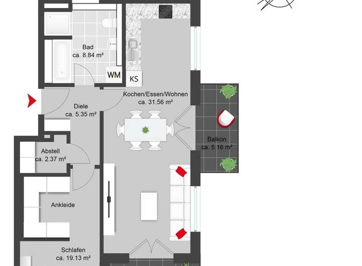 Die modernen acht Wohnungen teilen sich auf Grundrisse zwischen zwei Zimmern und dreieinhalb bzw. vier Zimmern/Räumen auf. So ist vom Single, über Pärchen bis hin zur kleinen Familie für jeden etwas dabei. Die individuell gestalteten Grundrisse richten sich nach verschiedenen Ansprüchen und Wohnbedürfnissen. Die Bewohner jeder Wohnung genießen den Luxus einer Terrasse mit eigenem Gartenanteil oder eines Balkons bzw. zwei Balkonen, um sonnige Stunden in den eigenen vier Wänden zu erleben. Große Fensterflächen bringen viel Tageslicht in die Wohnräume. Die zwei barrierefreien Wohnungen im Erdgeschoss mit Terrasse und Garten verfügen über großzügige, direkt verbundene Hobbyräume im Untergeschoss mit zweitem Badezimmer und Abstellräumen. Im Dachgeschoss liegen zwei per Lift erreichbare Dachterrassenwohnungen mit vielen Dachfenster-Flächen und großzügiger Raumatmosphäre.
